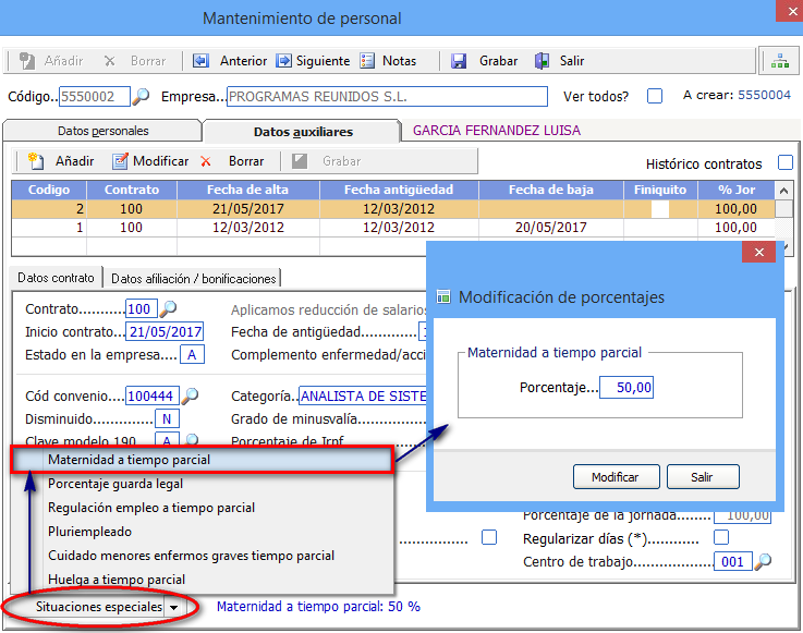 - Una vez grabada la nueva matrícula, pulsar el botón de Situaciones Especiales y seleccionar Maternidad a tiempo parcial. Indicar el porcentaje de descanso (tiempo no trabajado).