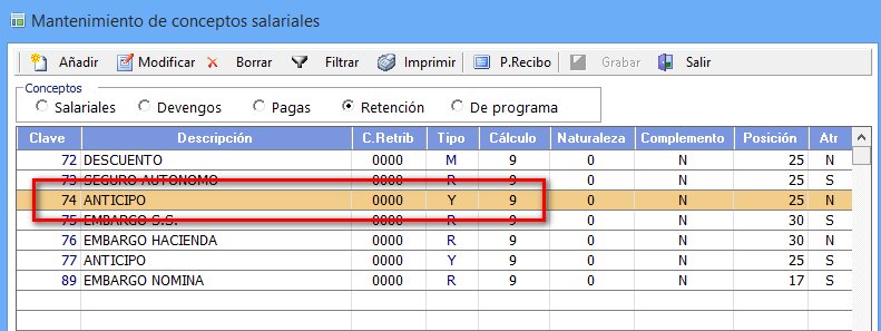 Para ello, crearemos un concepto en Mantenimiento → Auxiliares → Conceptos Salariales con un código entre el 73 y el 89 (ambos inclusive) como un anticipo (tipo Y).