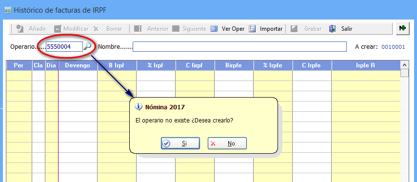 Funcionamiento: antes de grabar el apunte deberemos crear la ficha del profesional con los datos básicos que irán al 190. Para ello, en la casilla Operario pulsamos Enter y seleccionamos la empresa donde lo vamos a incluir.