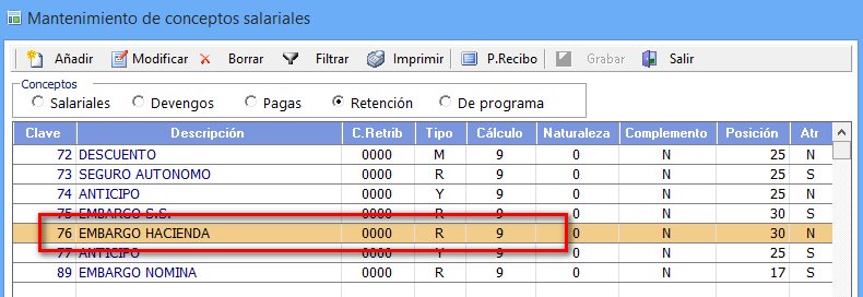 1. Crear un concepto (si no existe) entre el 73 y 89 (ambos inclusive) como un embargo (tipo R).