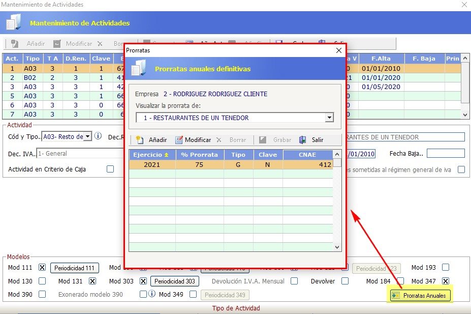 Una vez dentro de la empresa, en [Actividades], activaremos la opción "Prorratas anuales" haciendo clic sobre la opción "Modificar" situándonos en cada una de las actividades dadas de alta. En la pantalla de configuración, indicaremos: