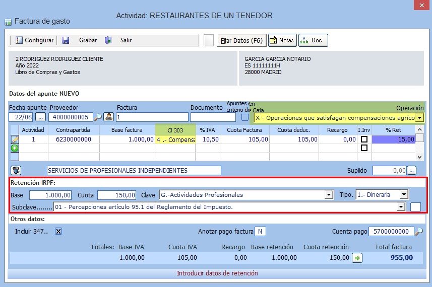 Al grabar el apunte, es necesario indicar si se desea incluir la cuota de la compensación de IVA en la base de retención o no: