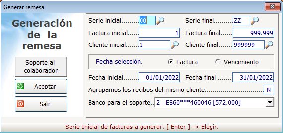 Mediante la opción Soporte del menú es posible generar un fichero de cobros de una remesa de facturas para la entidad financiera.