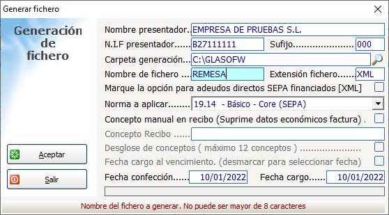 - Factura Inicial y Final: Rango de números de factura a incluir en el fichero de cobros.