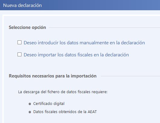 El alta de un declarante puede realizarse cumplimentando de manera manual sus datos o bien descargando a través de la web de la AEAT sus datos fiscales. Situados en la pantalla inicial tendrá que pulsar en [Alta declarante]: