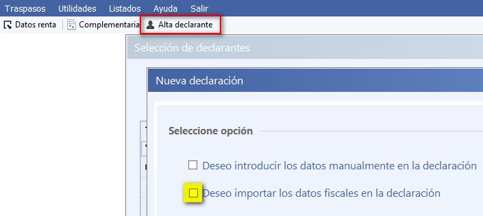 Para importar los datos fiscales del cónyuge de la declaración o descendientes perceptores ha de hacerse una vez creada la renta desde esta opción dentro del menú de opciones.