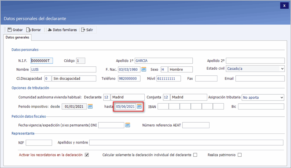 En el menú Datos Personales > Datos Generales en el apartado Periodo Impositivo, indicaremos como fecha fin la fecha de fallecimiento.