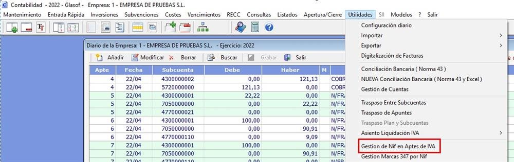 Para modificar el NIF también en los apuntes ya registrados, debemos acceder a Utilidades > Gestión de NIF en Aptes de IVA.