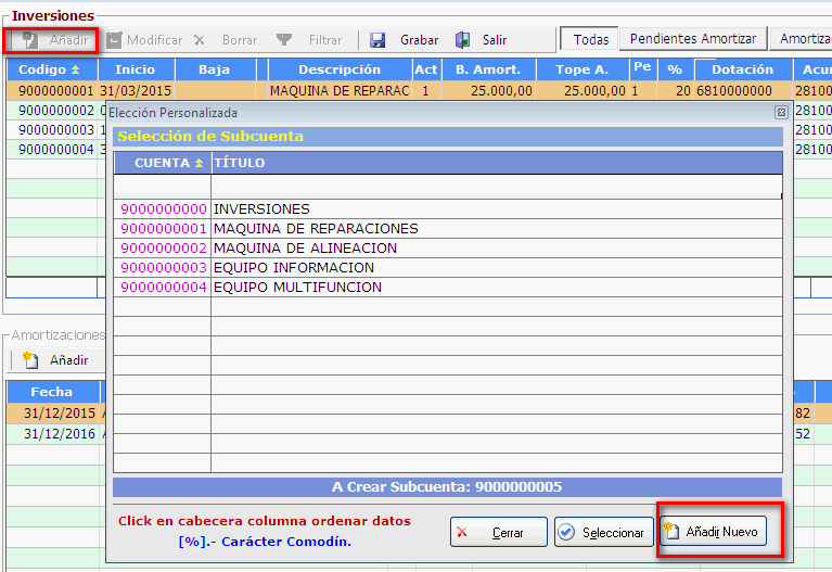 Es un dato obligatorio. Subcuenta contable en la que se ha contabilizado la inversión, siempre se tratará de subcuentas de la cuenta 90000. Escribimos 900 y pulsamos [Enter] para ver las inversiones que tenemos y crear una nueva: