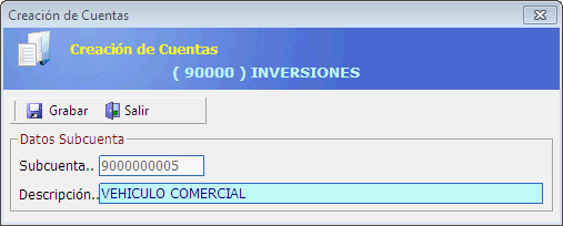Creamos la cuenta 90000005 “VEHÍCULO COMERCIAL”.