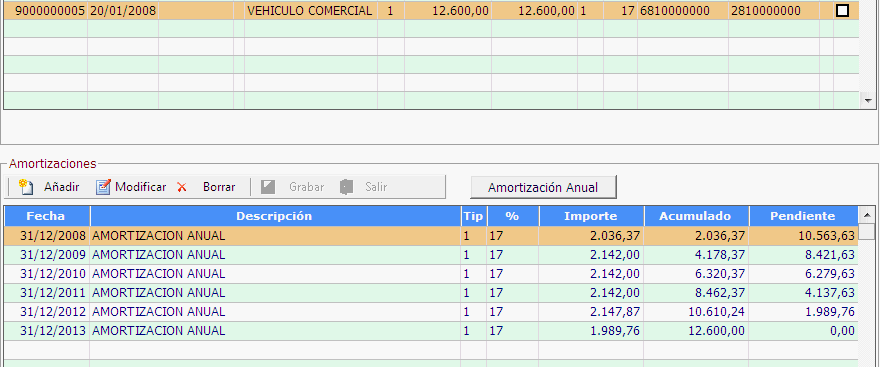 La aplicación nos registrará las amortizaciones de cada año:
