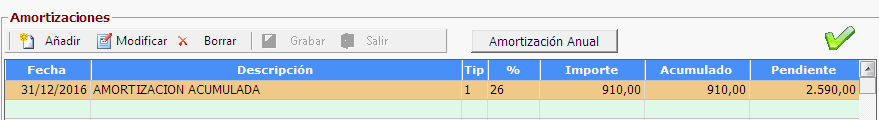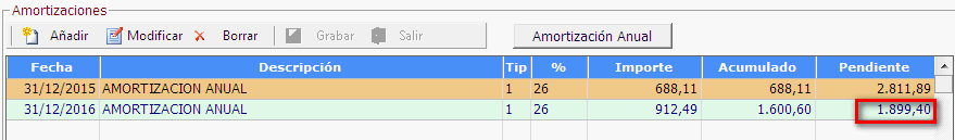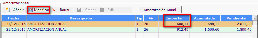 Nos situamos en la linea de la amortización del año que corresponda y pulsamos [Modificar] para sustituir el importe amortizado: