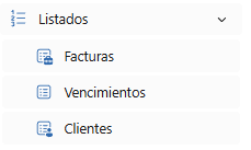 Desde el menú principal de cada usuario, dispone de la posibilidad de sacar listados varios para la comprobación de facturas, consulta de vencimientos u obtener un listado de clientes: