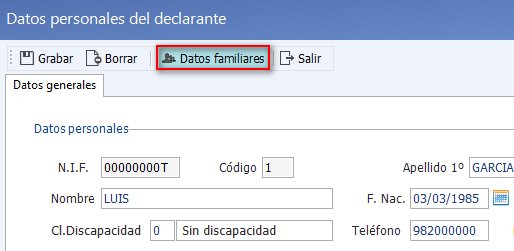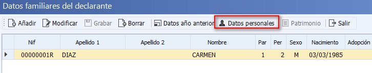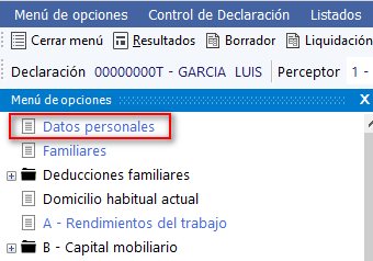 Dentro de la declaración en el menú de opciones pulsando en Datos personales se incluirán los datos identificativos del titular de la declaración.