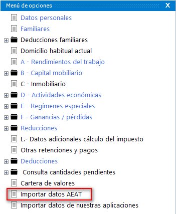 Para importar los datos fiscales del cónyuge de la declaración o descendientes perceptores ha de hacerse una vez creada la renta desde esta opción dentro del menú de opciones.