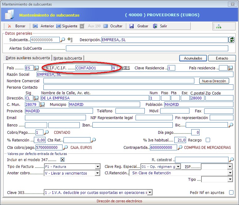 Con frecuencia contabilizamos facturas pero desconocemos en ese momento el NIF/CIF del proveedor/cliente. Para evitar tener NIF/CIF erróneos en la aplicación, existe un NIF/CIF especial llamado CONTADO que permite registrar estas facturas y con posterioridad, en listados IVA por ejemplo, visualizar de una manera sencilla las operaciones que tendremos que cambiar cuando tengamos el NIF/CIF correcto.